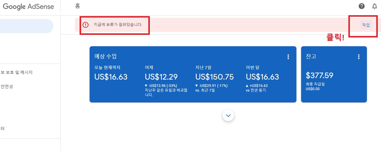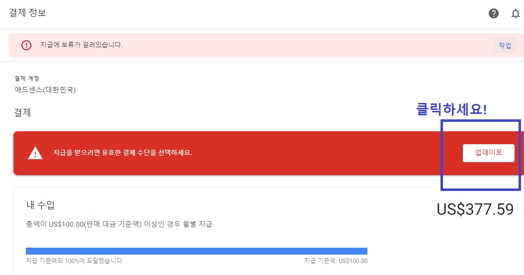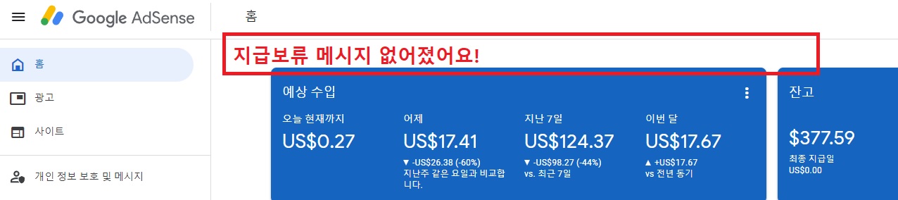 잔고가 377달러가 있음에도 계좌등록을 안해줬기 때문에 지급에 보류가 걸려서 애드센스 수익이 입금되지 않고 있었던 거예요.