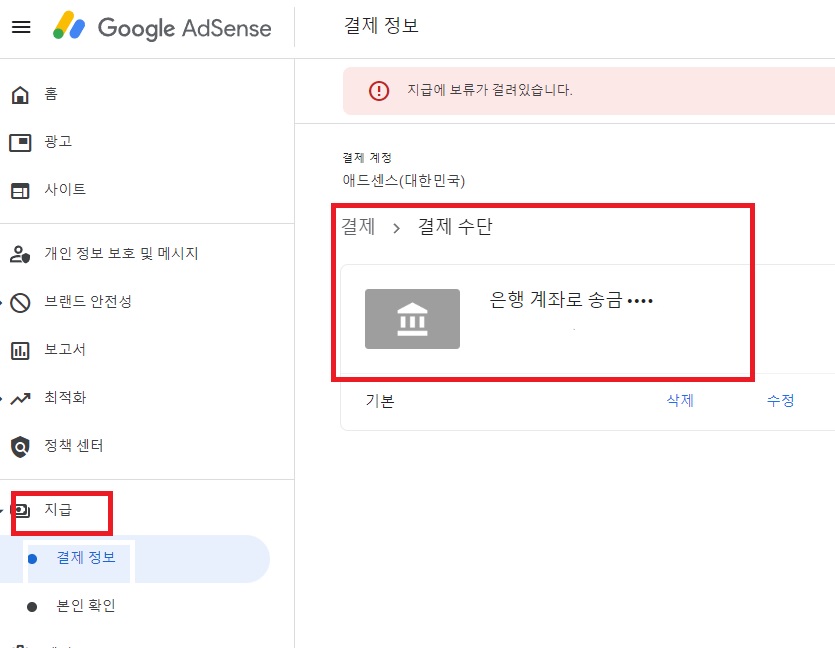 구글 애드센스 계좌 등록이 잘 되었는지 확인하기 위해서 애드센스 왼쪽 메뉴의 '지급'을 클릭하면 오른쪽 창에 결제 수단 정보가 뜨니 들어가셔서 확인해보시면 되겠습니다.