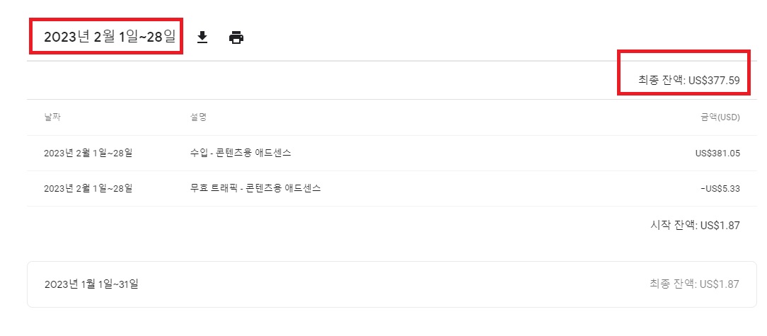 기간은 2023년 2월 1일 ~ 28일까지의 수익입니다. 무효트래픽 제외하면 377.59달러입니다.