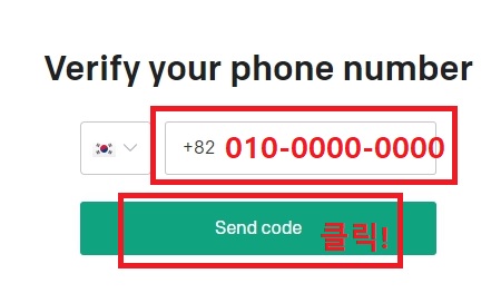 한국 코드인 +82는 자동으로 선택되어 있습니다. 뒤에 내 핸드폰 번호를 입력 후, Send code 를 클릭해주세요.