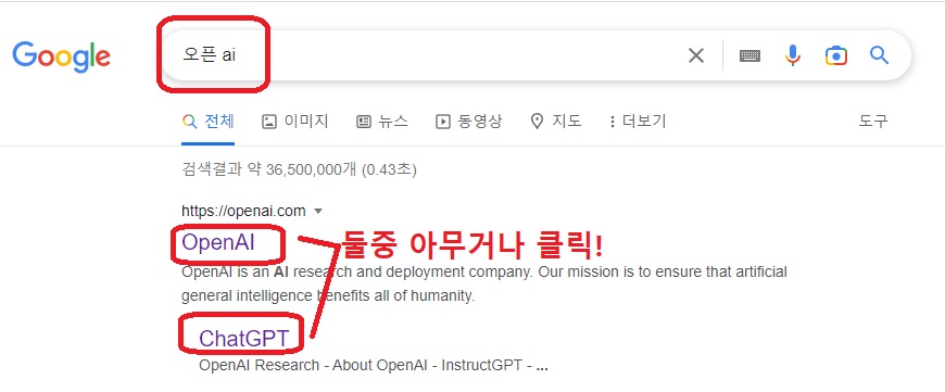 OPEN ai를 기반으로 한 'chat GPT' 사이트는 구글이나 각종 포털 사이트에서 'chatgpt'를 검색하면 첫 줄에 사이트가 나옵니다.