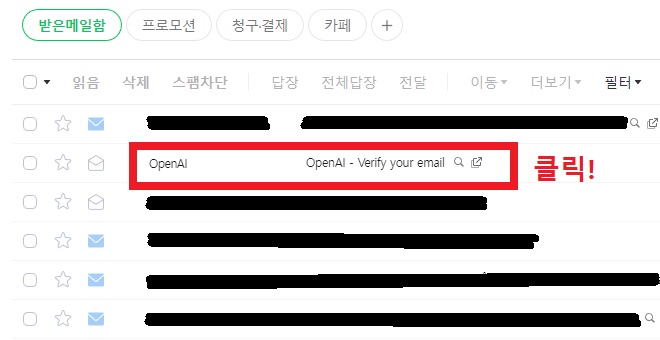 위에서 입력한 메일의 받은편지함을 확인하면 바로 open ai 에서 메일이 하나 날라와있습니다.