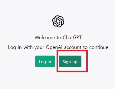 웰컴 투 ChatGPT 화면이 뜨면 Sign up 을 눌러 간단히 회원가입을 하면 됩니다. 메일주소만 있으면 가입완료가 됩니다. (자세한 내용은 아래 설명해드릴게요)