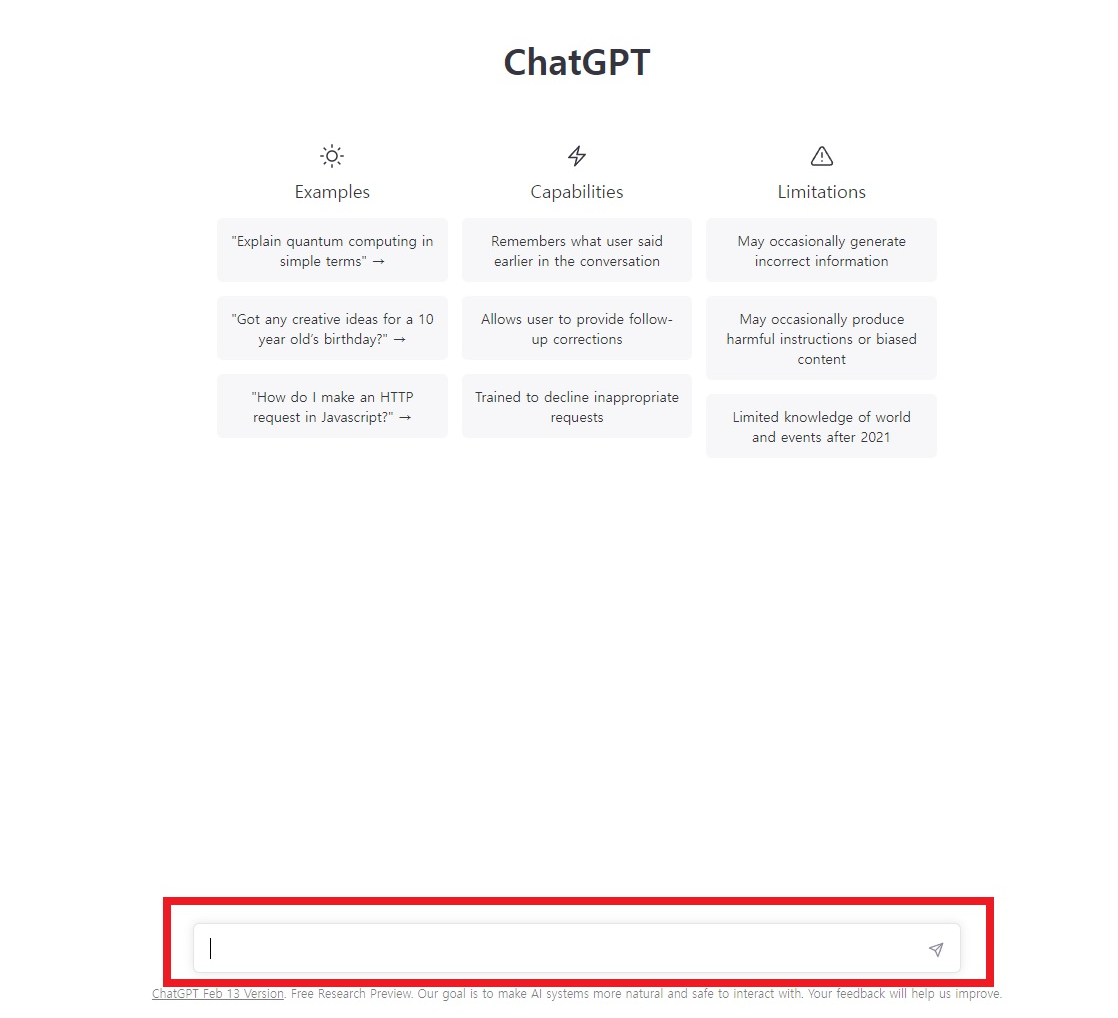 바로 open ai를 기반으로한 chat GPT를 이용하실 수 있습니다. 빨간 네모표시가 되어있는 곳에 한글 or 영문 or 기타 언어로 질문을 하면 chat GPT가 각종 지능형 정보들을 입력해줍니다.