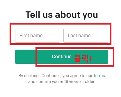 클릭하면 open ai 에 이름을 입력하는 칸이 뜹니다. first name과 last name 입력 후 다음(Continue) 클릭해주세요.