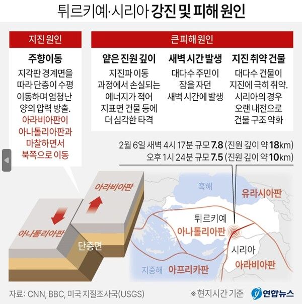 터키 지진의 원인은 '주향이동' 때문으로 지각판 경계면을 따라 단층이 수평이동을 하면서 엄청난 양의 압력이 방출되었습니다. 아라비아판이 아나톨리아판과 마찰하면서 북쪽으로 이동하면서 대규모 터키 지진이 발생하게 되었습니다. 여기에 엎친 데 덮친 격으로 진원의 깊이도 얕았고, 새벽 시간에 발생하여 대다수의 주민들이 잠을 자던 시간에 발생하였습니다. 게다가 시리아의 경우는 오랜시간동안 지속되어온 내전으로 인해 건물의 구조가 약화되어서 더욱 큰 피해가 발생하였습니다.