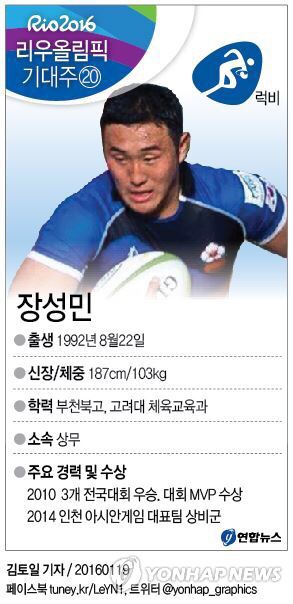 대한민국 국가대표 럭비선수 장성민입니다. 포지션은 윙이라고 하지만 거구의 체력과 순발력을 지녀서 가능한게 아닐까 싶습니다. 도쿄 올림픽 럭비 국가대표로도 활동을 했다고 합니다.
