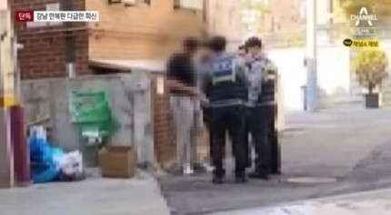 편의점 앞으로 가까스로 도망친 여성은 초조한 듯 서성이다가 곧 도착한 순찰차를 향해 손짓을 했으며, 경찰과 여성은 60m 떨어진 다세대 주택으로 함께 향했습니다. 잠시 뒤 집 앞에는 구급차가 도착했고, 집 근처에서 건장한 거구의 체격 남성을 발견했습니다.