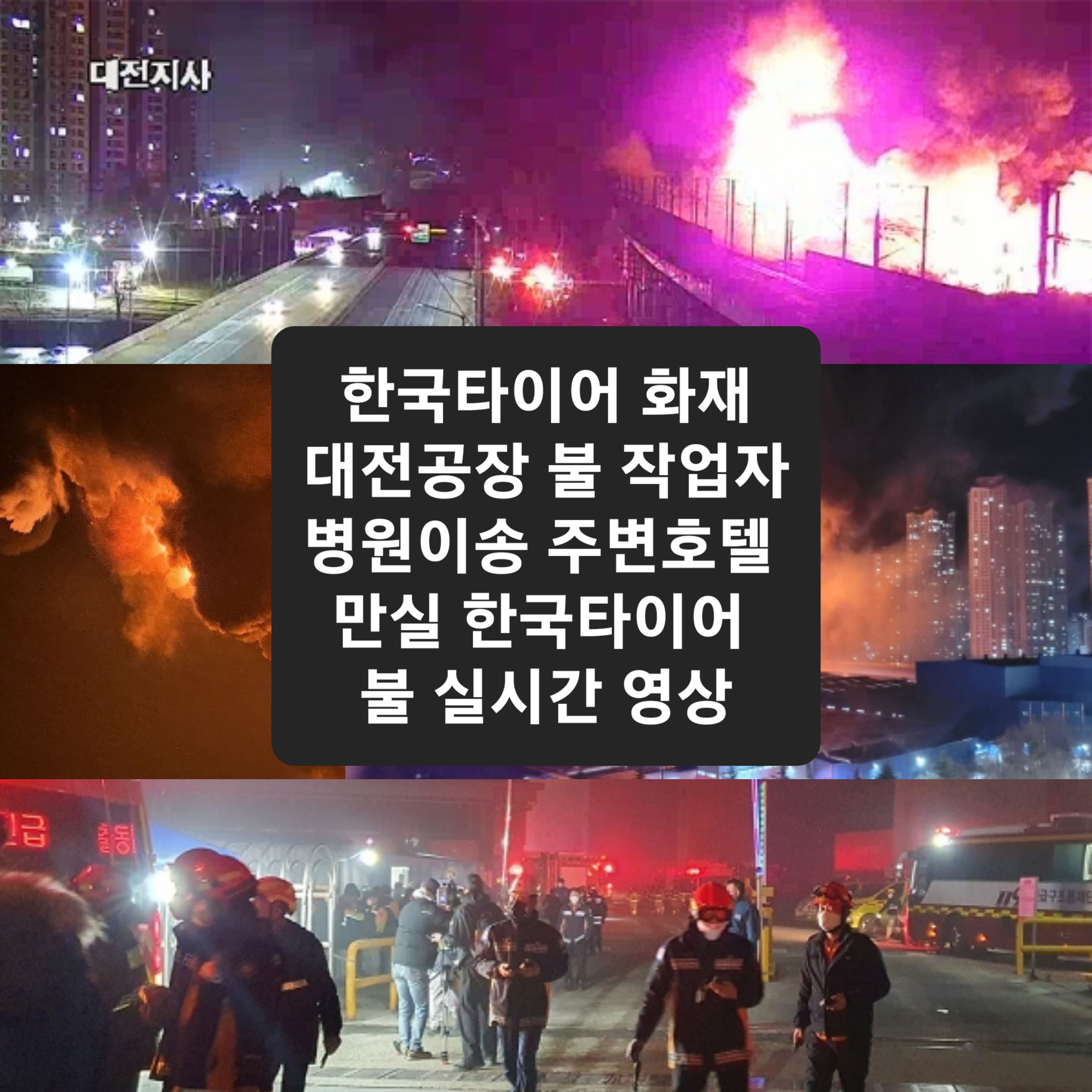 어젯밤인 2023년 3월 12일 일요일 오후 10시 9분 대전 대덕구 목상동에 있는 "한국타이어 대전공장"에서 대형 화재가 발생해 작업 중이던 노동자 9명이 병원으로 이송됐다. 공장 작업자 9명중 5명은 연기를 많이 흡입한 상태라고 밝혔습디다. 소방당국은 현재 새벽1시반까지도 큰 불길을 잡지 못한 상황이다. 불길이 계속 번지자 한국철도공사는 공장 옆을 지나는 경부고속철도 운행을 중단했다.