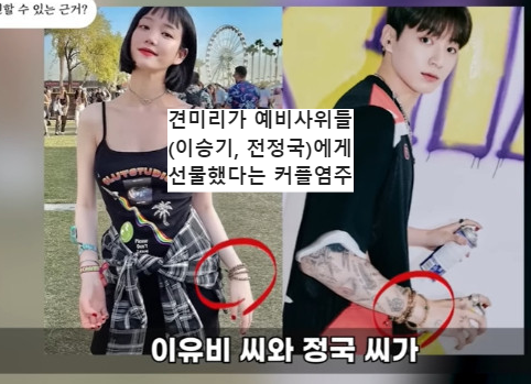 2. 정국과 이유비는 커플 맨투맨 티셔츠와 커플(같은) 팔찌 (염주외에 차고있는 팔찌가 같음)를 착용했습니다.